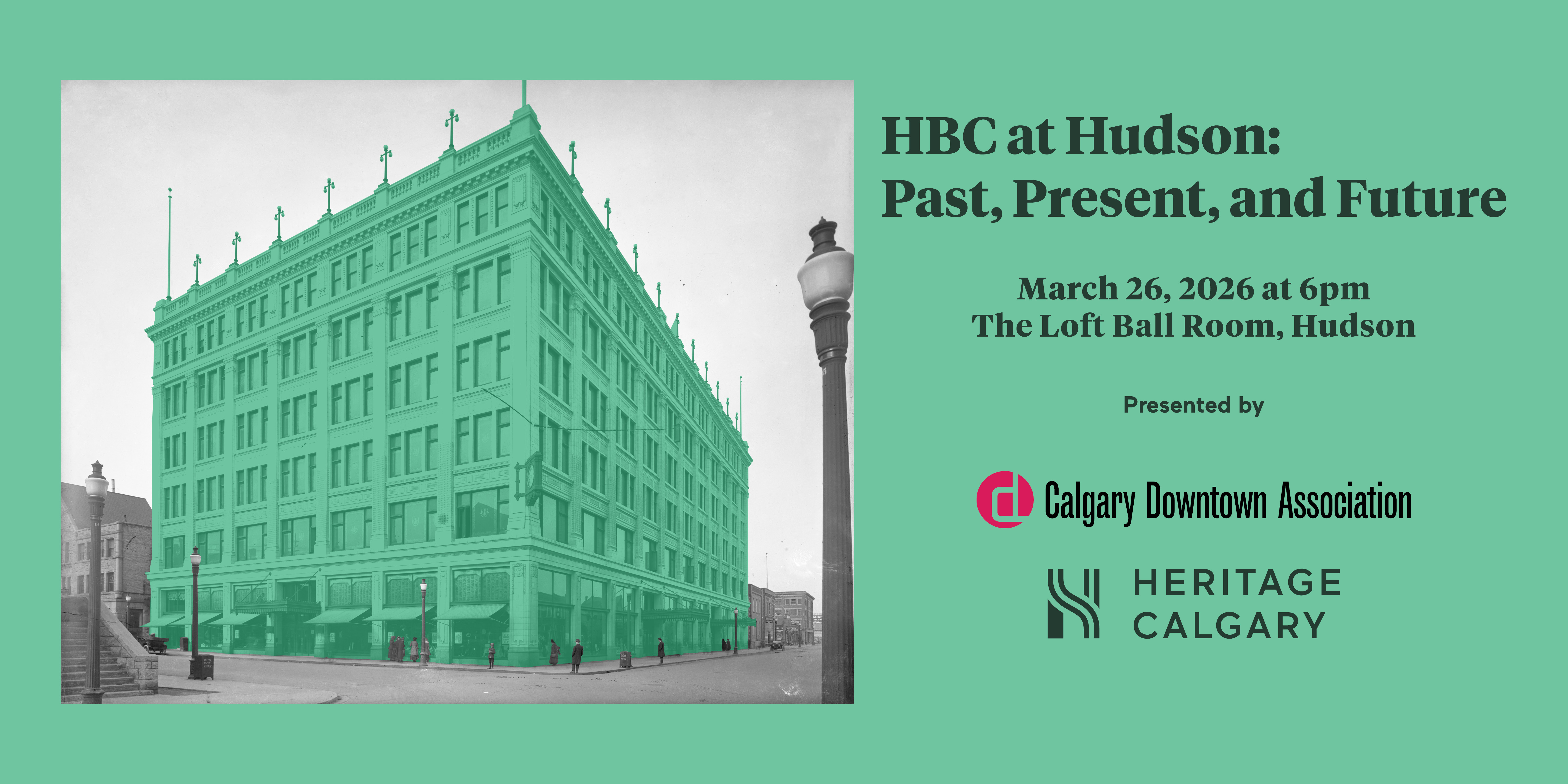 Heritage Calgary, in partnership with the Calgary Downtown Association, invites you to an engaging information session on Calgary's iconic Hudson Bay Company Building. Join us and hear from a panel of experts about the building's past, present, and future. There will be time for Q&A and networking. Light refreshments will be served.